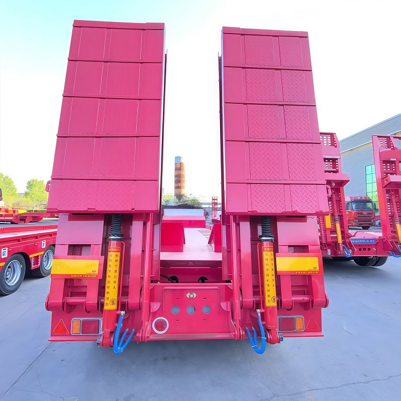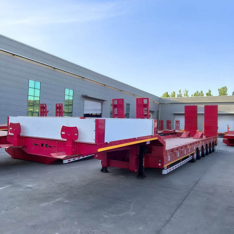 longitudinal beam section is I-shaped, which has the characteristics of high rigidity and high strength. 2.The main plane of the frame and cargo platform is low, which ensures the stability of transportation and is suitable for carrying all kinds ofconstruction machinery, large equipment and steel.