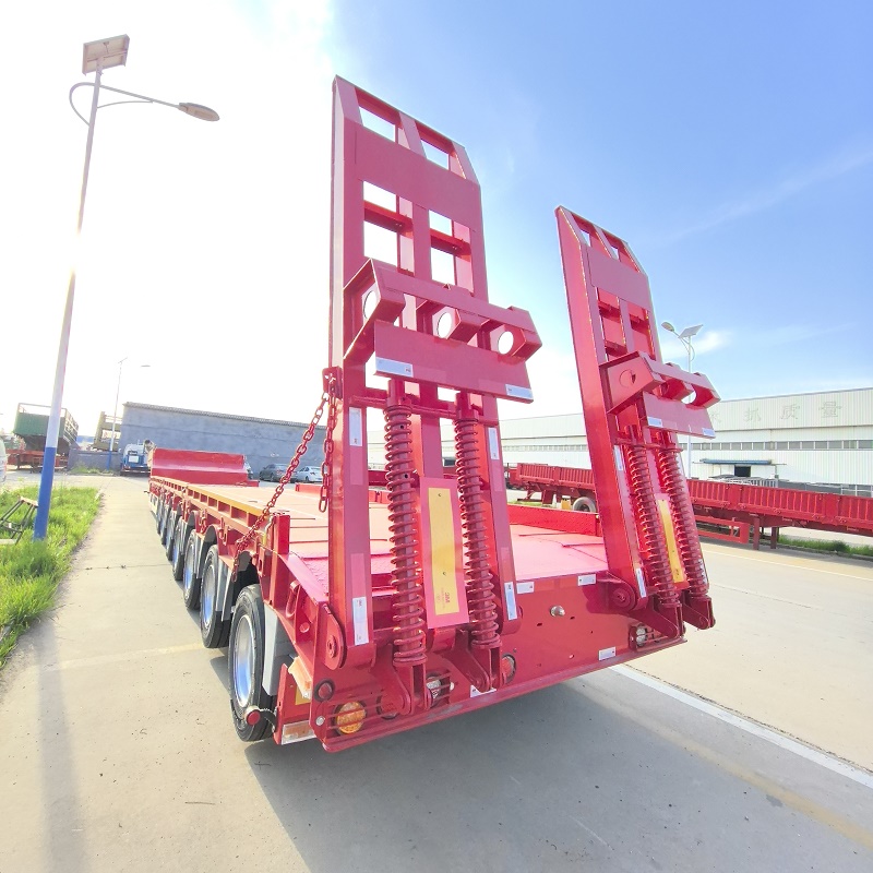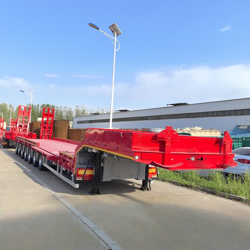 Low flatbed semi-trailers have flatbed, concave beam and tire exposed structures, and the longitudinal beams are straight or gooseneck. The frame is stepped, and the cross section of the longitudinal beam is I-shaped, which has the characteristics of high rigidity and high strength.